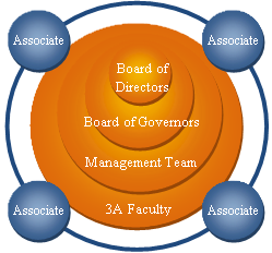 3A maintains an in-house faculty of specialist coaches, advisors, trainers, consultants, researchers and facilitators. Known as the "3A Faculty", these members are selected base on a set of criteria and are constantly monitored to ensure shared values, consistent quality and unreserved commitment. The outer rim of OCS represents the network of Associates and Strategic Partners, nominated and appointed from various parts of Asia and Greater Asia.